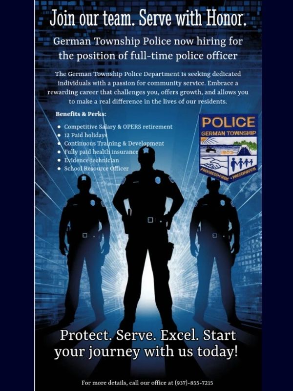 The German Township Police Department is currently looking to hire a full time police officer. Email Clerk@germantownshippolice.org for more information